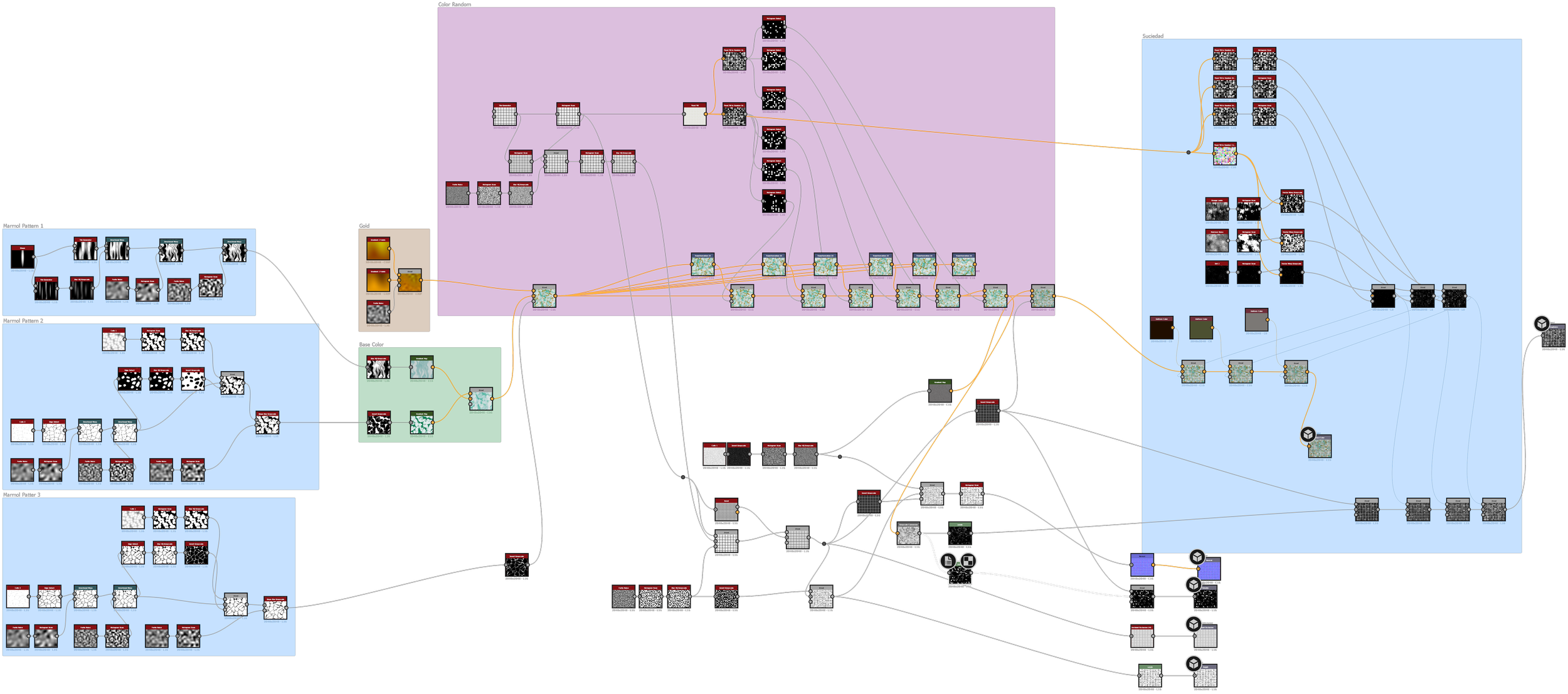 I started the aging pass by building a pattern from a custom shape made with shapes and tile sampler grayscale. I randomized it using a vector warp (grayscale), and finally converted that same detail into a normal so I could generate a Curvature map that I used to color this variation.