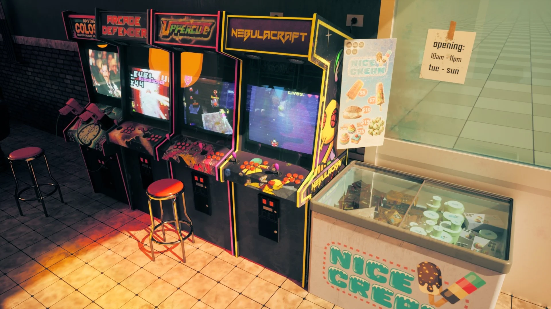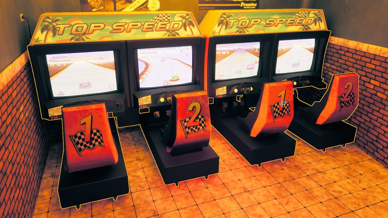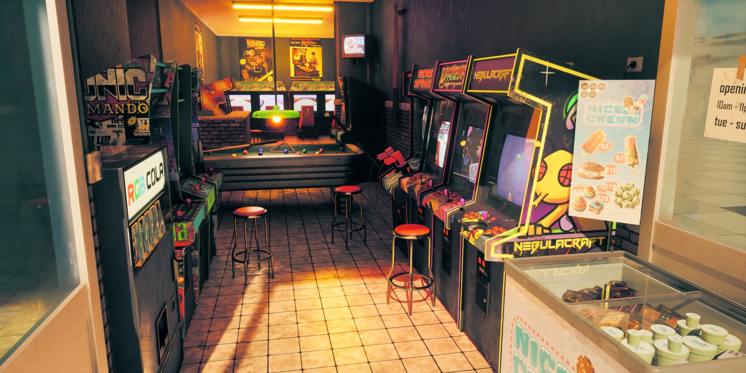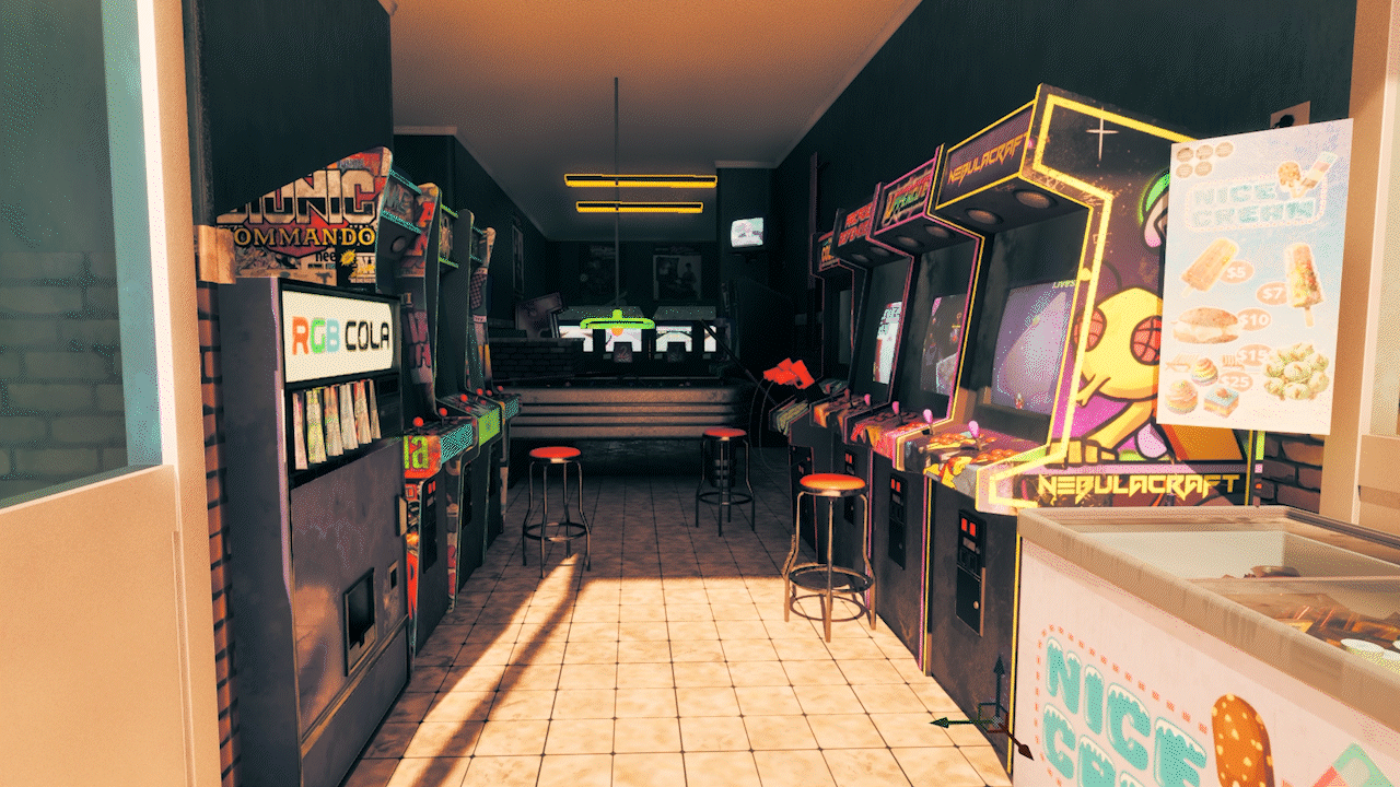 The scene is built around an arcade-focused environment, where I customized the machines and props to reflect friends’ projects and early 2000s-inspired themes, aiming for a nostalgic but grounded mood.