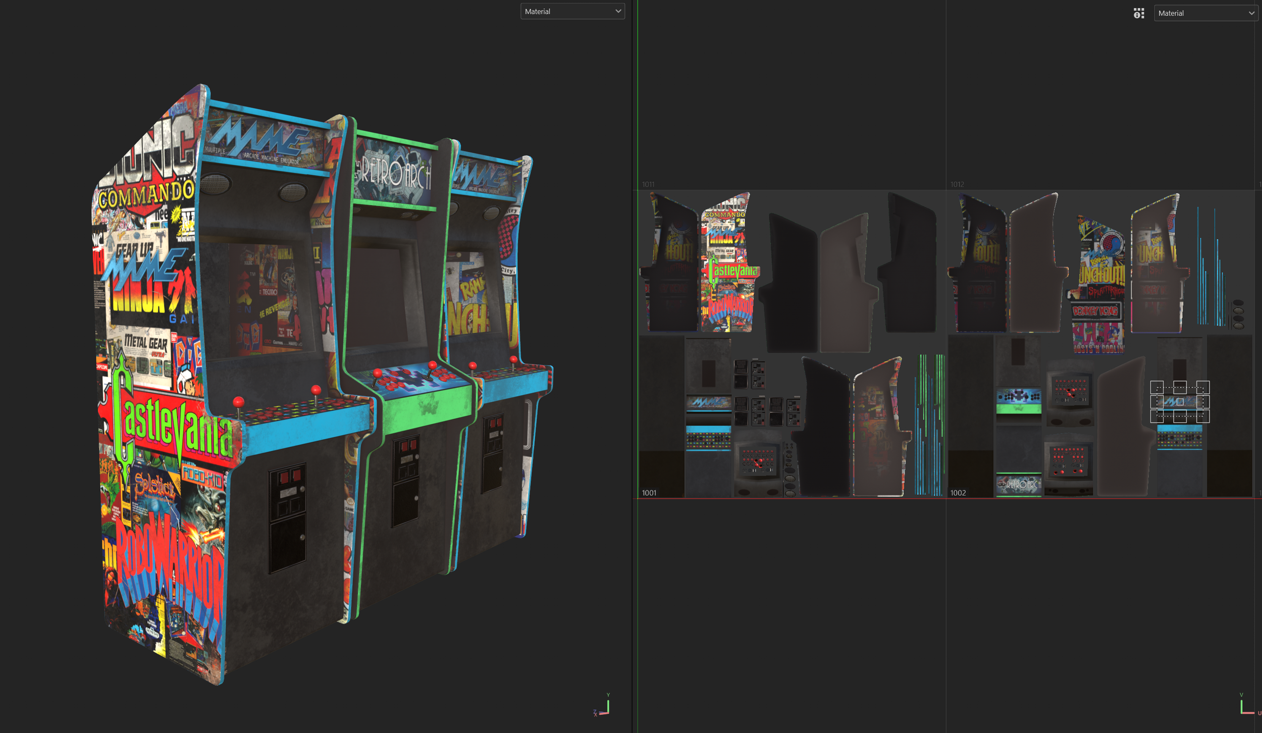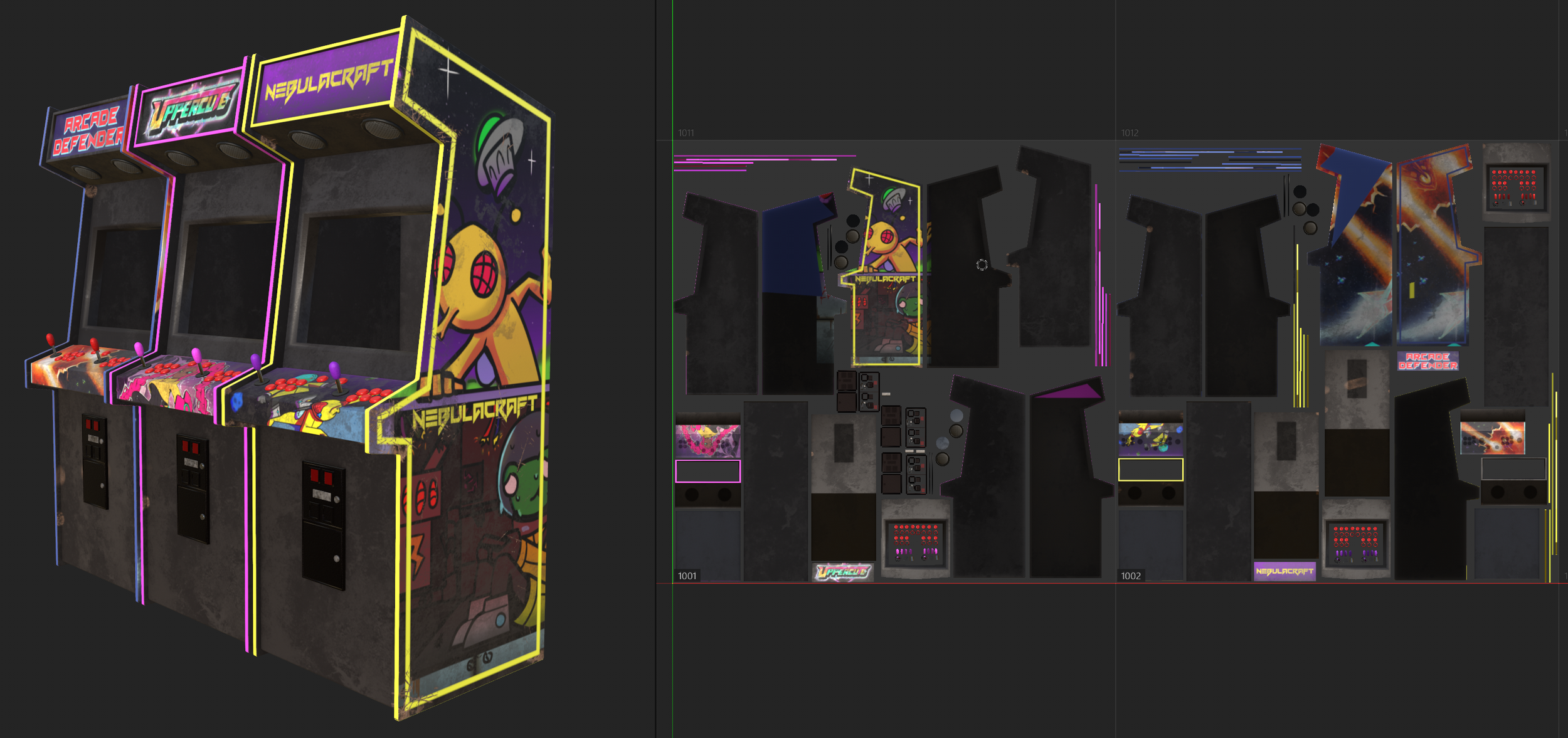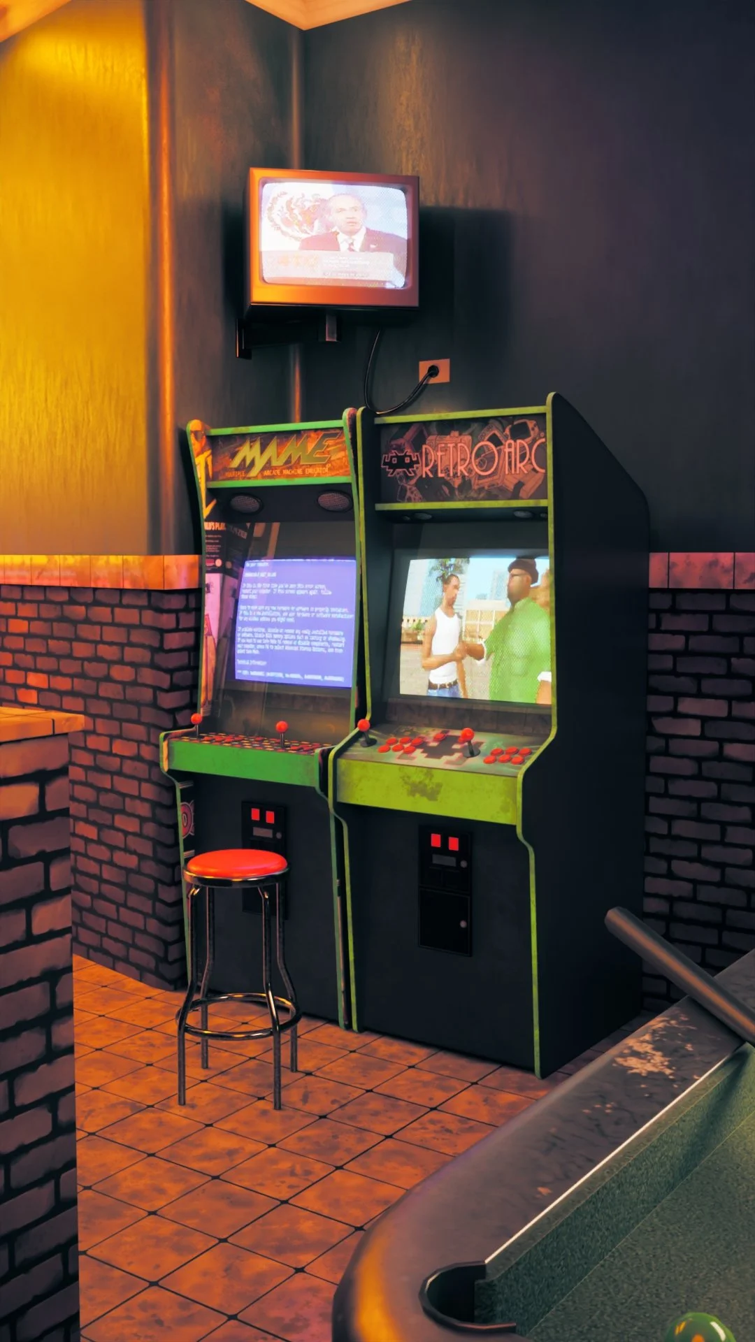 The scene is built around an arcade-focused environment, where I customized the machines and props to reflect friends’ projects and early 2000s-inspired themes, aiming for a nostalgic but grounded mood.