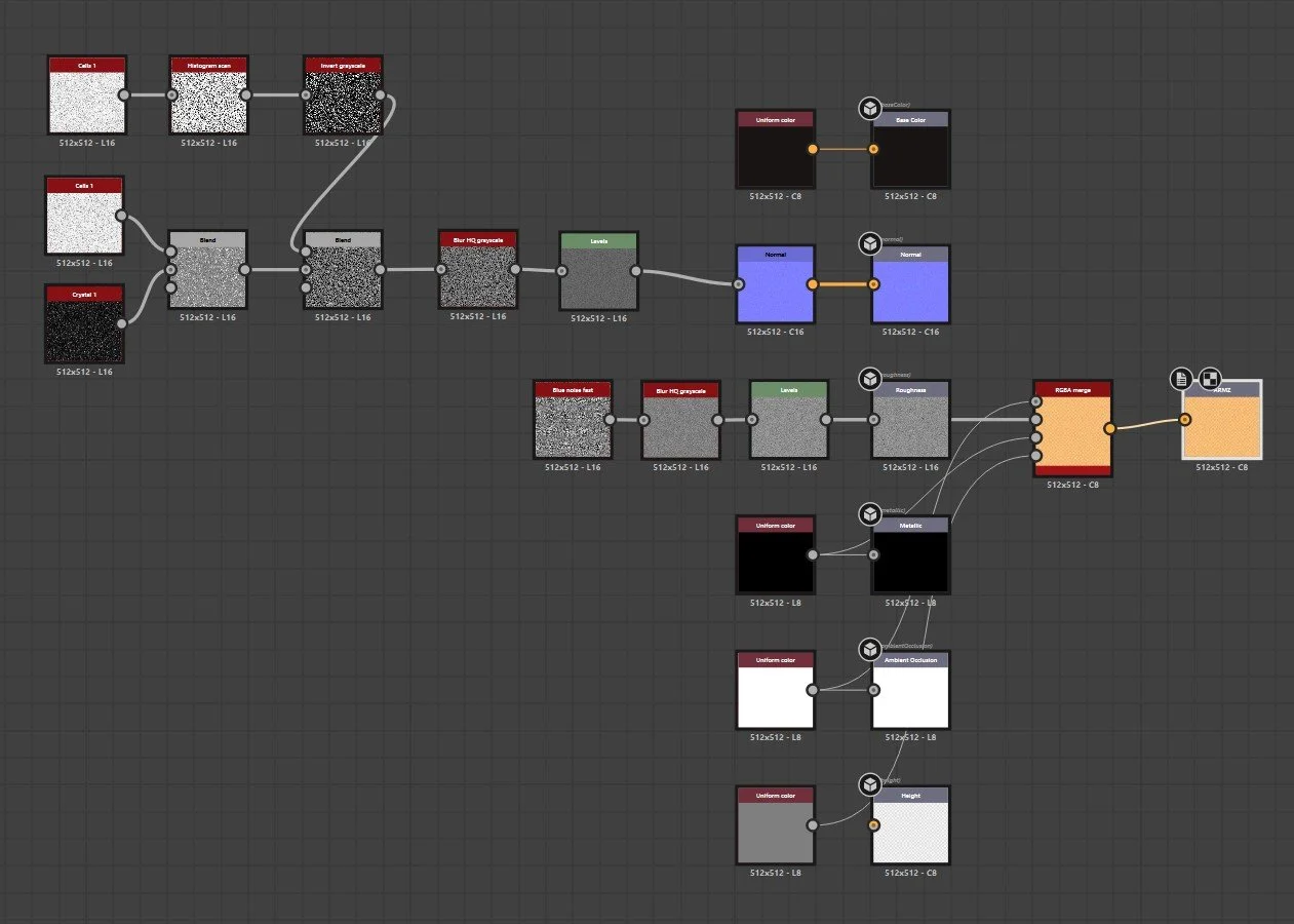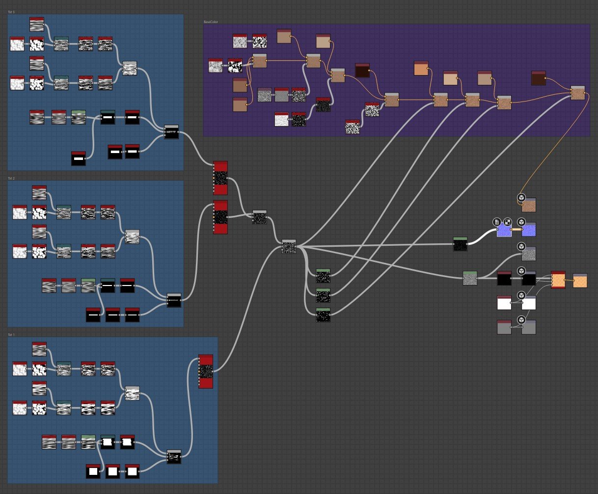 Procedural bases refined with manual modeling/sculpting and targeted texture work