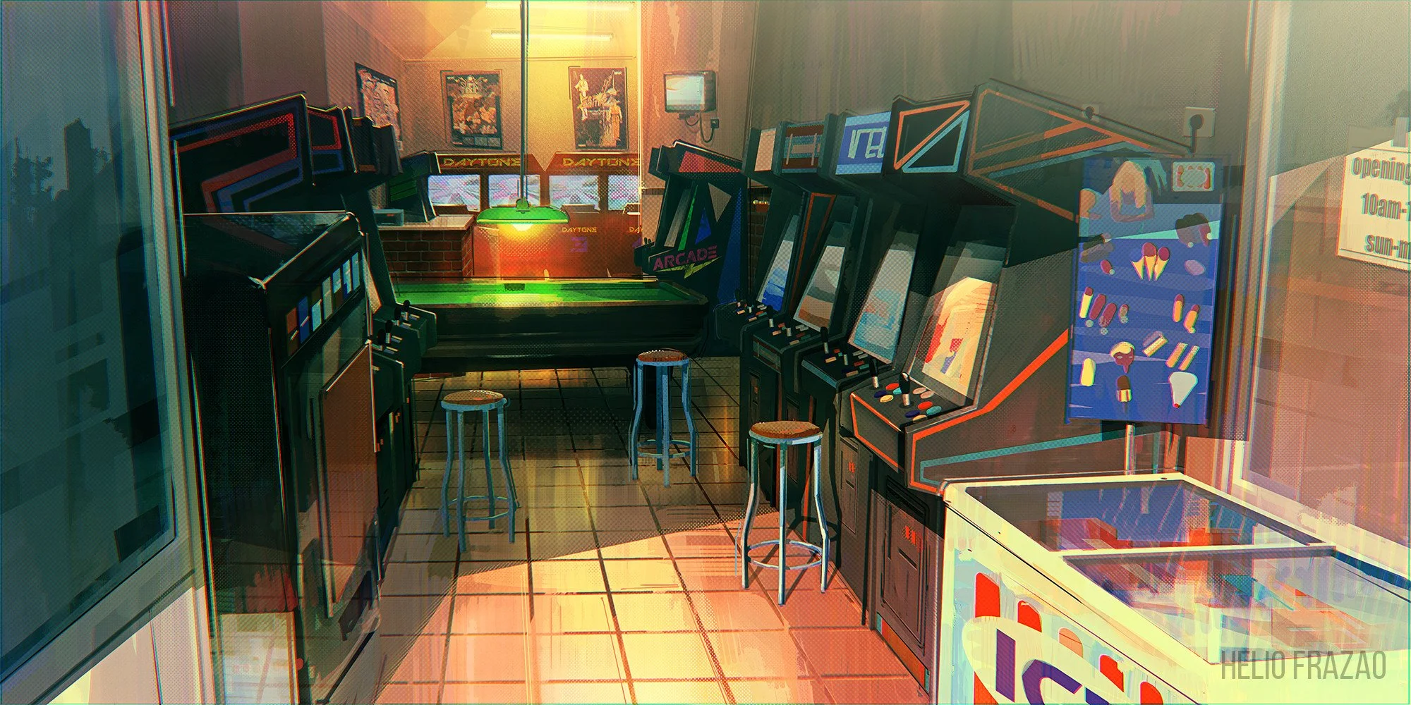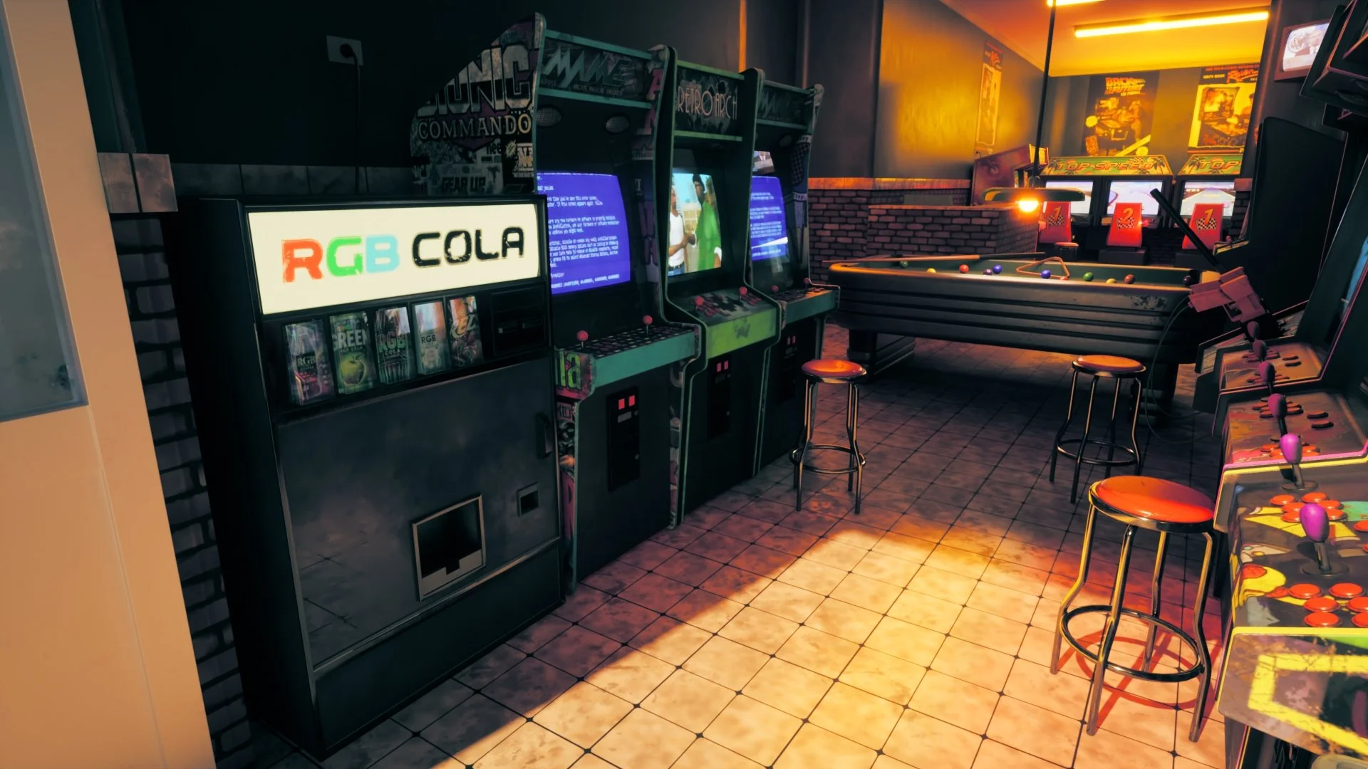 High number of practical lights (signage, machines, ambient fixtures)